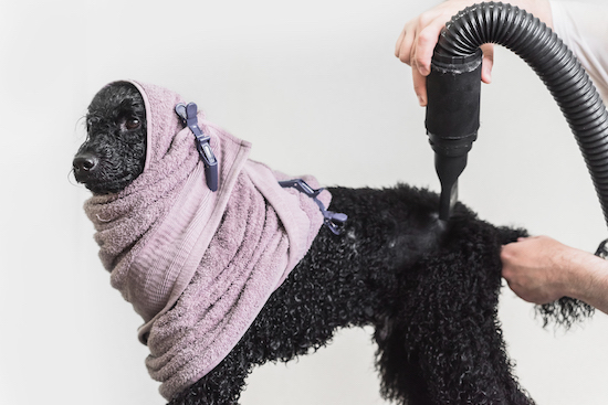 Uw hond wordt gedroogd en de losse haren worden uitgeblazen voor een schone vacht.